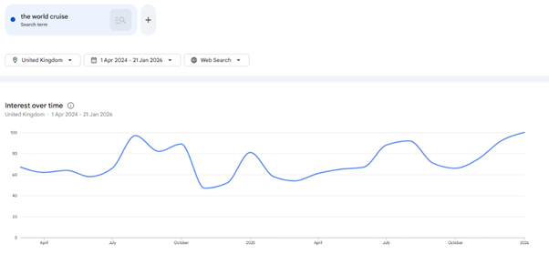 Interest in world cruises is at its highest level since early 2024 and up 5% compared to the previous period. Iglu confirms an uplift in bookings at the same rate. In January, it’s increasingly popular to embark on an annual world cruise. And why not? Sailing westward from Southampton, staying in warm climes, and seeing amazing parts of the world, whilst having plentiful time to relax and live a different life on board, it’s a dream come true.